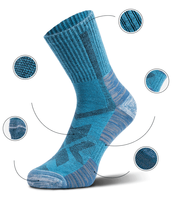 Nasze skarpety trekkingowe wykonane są z odpowiednio zbalansowanej mieszanki wysokiej jakości wełny merynosów i włókien technicznych. Efekt? Komfort przez cały dzień — mniej wilgoci, mniej pęcherzy, bez nadmiaru materiału i bez uczucia swędzenia.